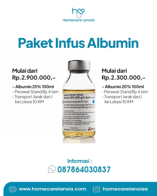 Jaga kesehatan orang tercinta dengan Paket Infus Albumin dari Homecare Lansia. Hubungi kami sekarang untuk konsultasi dan dapatkan layanan terbaik langsung di rumah Anda.